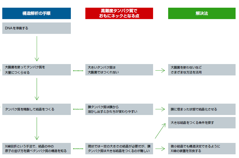 このように、一口に「高難度タンパク質」といっても、タンパク質によって難しい部分が違います。高難度タンパク質の研究に取り組むには、こうした困難を克服するための技術開発を進めていかなければなりません。