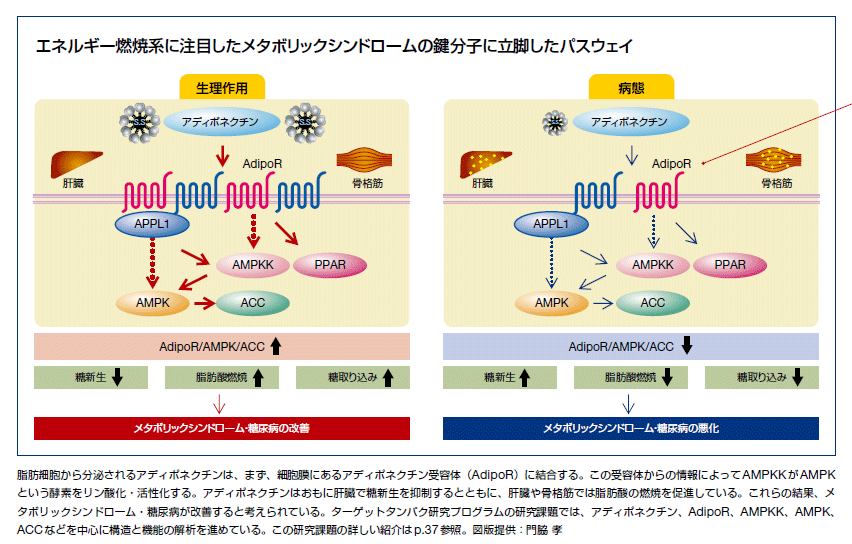 例えば、善玉物質の刺激ではたらくタンパク質の構造と機能を解明し、そのはたらきを強めるような物質を見つけられれば、それが治療薬の開発の手がかりとなります。「ターゲットタンパク研究プログラム」では、実際に、善玉物質の一種「アディポネクチン」に着目して、そのような研究を進めています。ターゲットは、アディポネクチンが作用する際にはたらくいくつかのタンパク質ですが、その中に、とりわけ構造解析の難しいものがあります。細胞膜にあるアディポネクチン受容体というタンパク質で、本研究プログラムに参加している東京大学大学院医学系研究科の門脇孝教授らが発見しました。