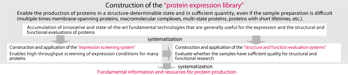 In addition, we will serve as a basis to prepare samples suitable for structural and functional research, by constructing an "expression screening system," in which many expression protocols and crystallization conditions for difficult target proteins are optimized and systemized.
