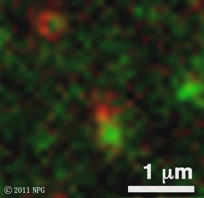 VAMP727 compartments target SYP121 foci on the plasma membrane. Root epidermal cells of A. thaliana expressing TagRFP-VAMP727 (red) and GFP-SYP121 (green) were observed by TIRFM. This movie consists of 147 TIRF images acquired every 100 msec. The membrane compartment bearing?@VAMP727 specifically targeted the static SYP121 foci, where they seemed to be tethered, flapping like a flag. |