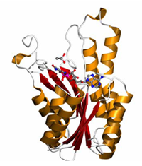 プロスタグランジン(PG)F2αは,PGF合成酵素の働きによって生合成され,子宮平滑筋の収縮作用を有し,陣痛促進剤として広く臨床応用されている生理活性物質である.しかし,寄生虫に感染した宿主の血中に検出可能なレベルでPGF2αが生合成され,Nagana病に見られるような家畜の流産などが深刻化している.そこでNagana病の原因となる原虫トリパノソーマTrypanosoma bruceiが持つヒトと薬剤感受性の異なるPGF合成酵素を分子生物学的に同定し,2.1Å分解能で構造を決定した.本酵素はアルドケト還元酵素(AKR)のスーパーファミリーに属し,活性中心にはCatalytic tetradと呼ばれる4つのアミノ酸残基が存在し,どのアミノ酸が欠損しても活性がなくなることが示唆された.しかし,Mutation実験を行い,Lys77およびHis110の2個のみが反応に関与し,Catalytic dyadで進行する新たな反応機構を提唱した.