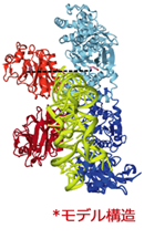 ヒトCIP4やFBP17等のEFCドメインを保持するタンパク質は,エンドサイトーシスや細胞分裂等の膜変形を伴う現象への関与が示唆されていた.これらのタンパク質のEFCドメインの結晶構造を決定したところ,EFCドメインは長く伸びた弓型の二量体を形成しており,弓型の内側が生体膜との結合や,生体膜のチューブ化に重要であることが分かった.タンパク質による生体膜のチューブ化には,タンパク質の生体膜上でのフィラメント化が重要な役割を果たす場合があることが示唆されてきた.実際,FBP17のEFCドメインはフィラメントを形成することが報告されている.今回の構造決定により,ヒトCIP4やFBP17のEFCドメインが,結晶中で類似のフィラメント構造を形成することを確認した.これに基づき,EFCドメインによる生体膜チューブ化の推測モデルを提案することが出来た.